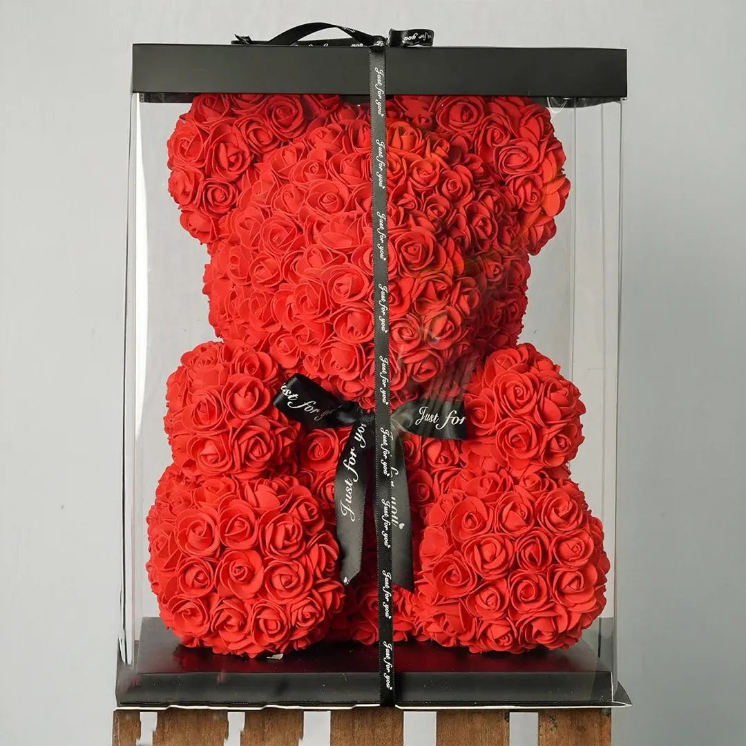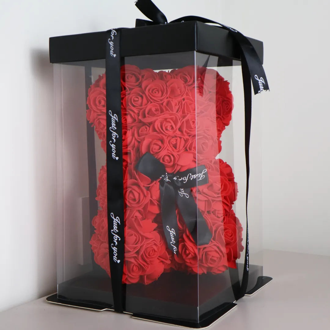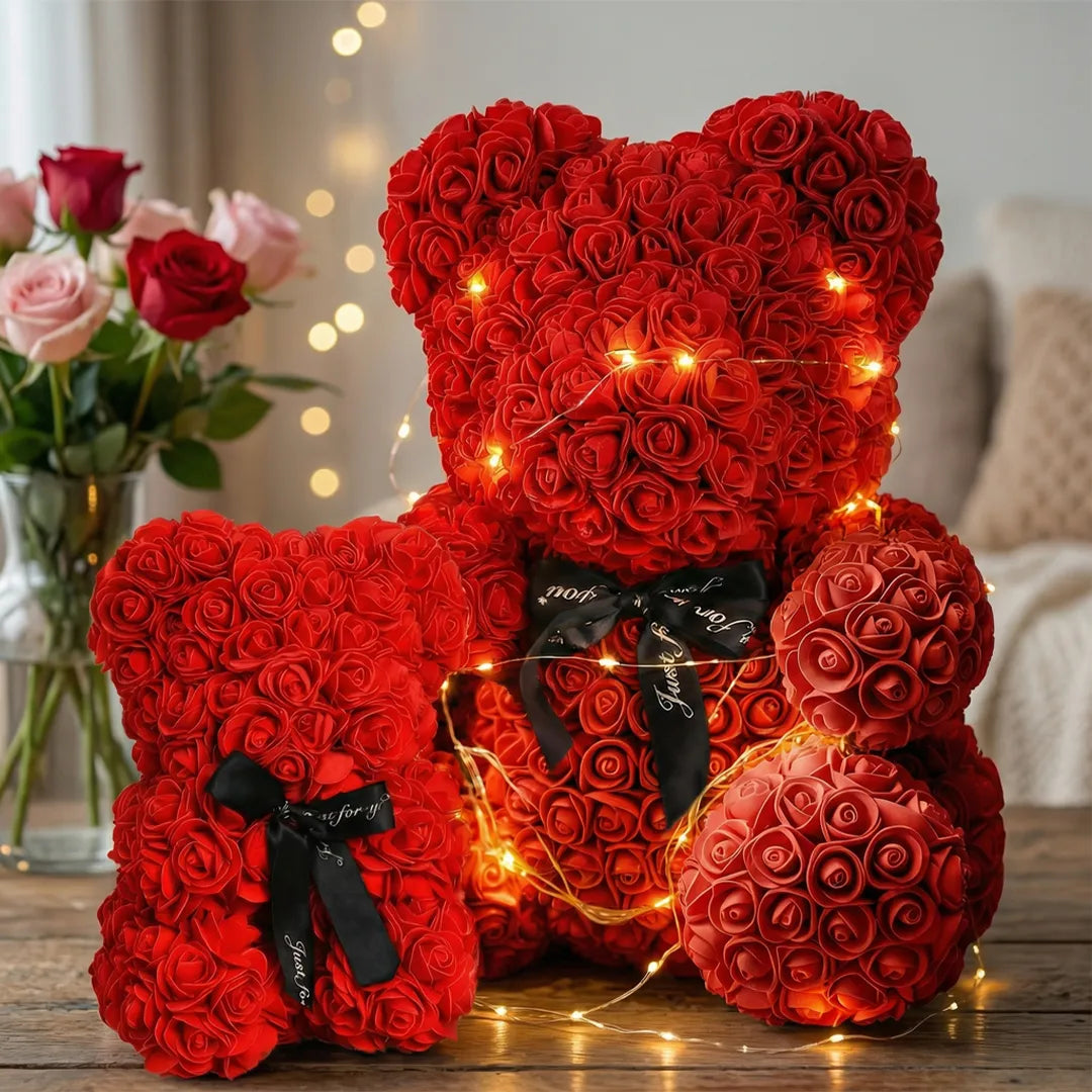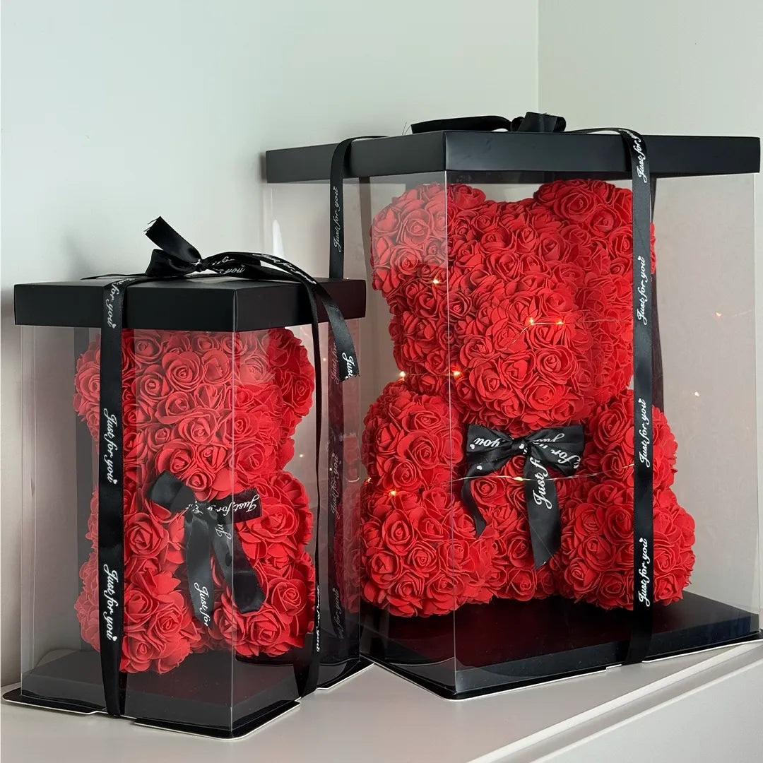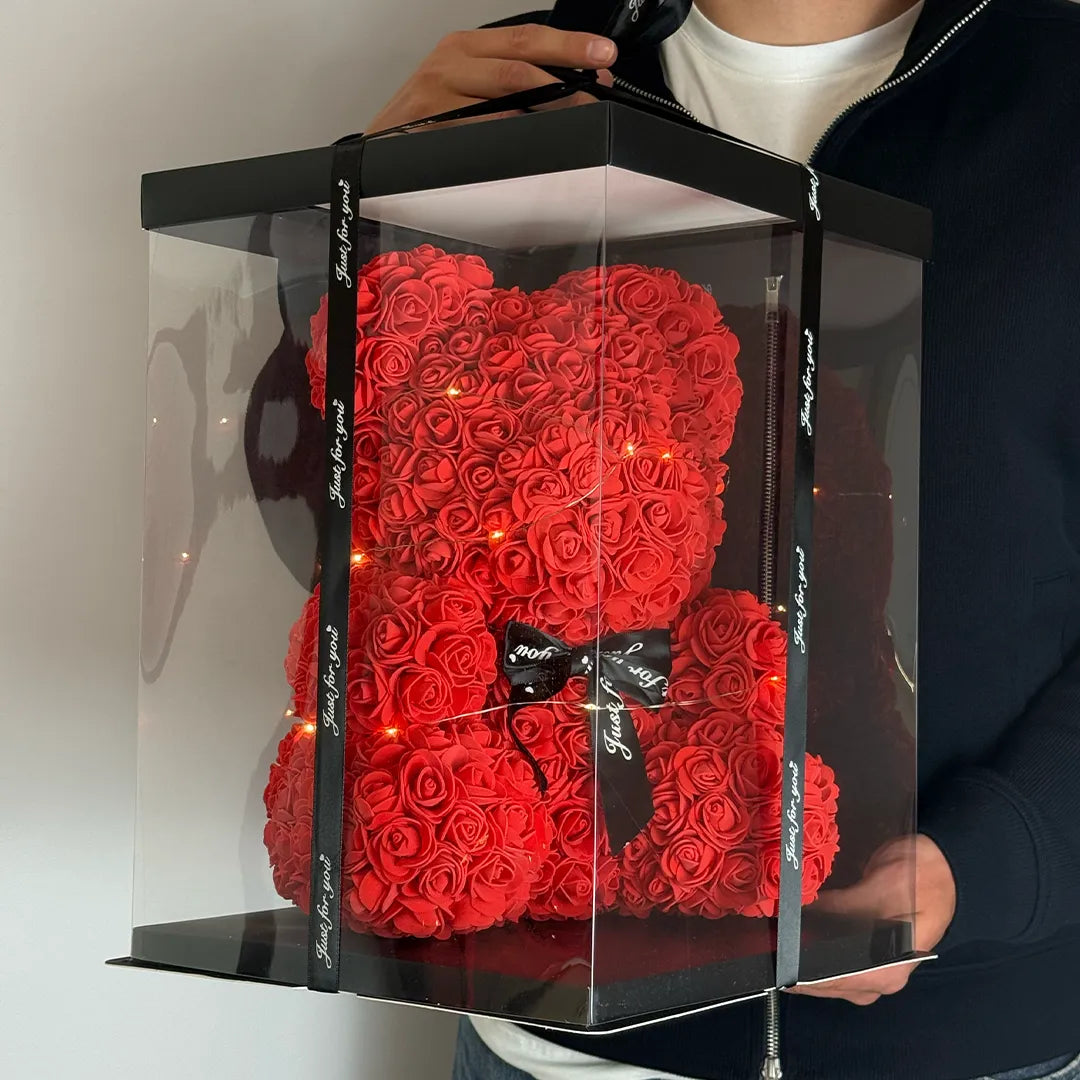 Miś z róż w eleganckim pudełku prezentowym – 22 cm / 35 cm / 35 cm z girlandą LED